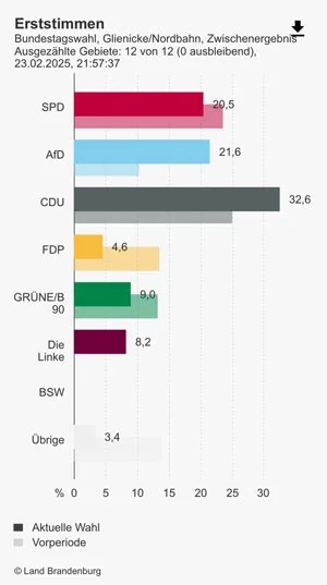 Die überragende Wahlbeteiligung von über 89 Prozent lässt dieses CDU-Ergebnis nicht nur über dem Bundesdurchschnitt, sondern auch deutlich über dem in Brandenburg besonders überzeugen. Ihre circa 33 Prozent der Erststimmen für Uwe Feiler legen ein klares Bekenntnis zur politischen Mitte ab. Und zu dem nach drei Jahren „Ampel“ dringend notwendigen Politikwechsel mit Friedrich Merz als Bundeskan(n)zler.
